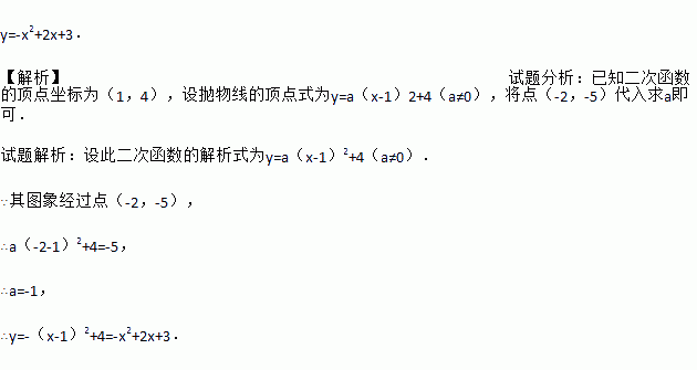 已知二次函数的顶点坐标为(1,4),且其图象经过点(-2,-5),求此二次函数的解析式。