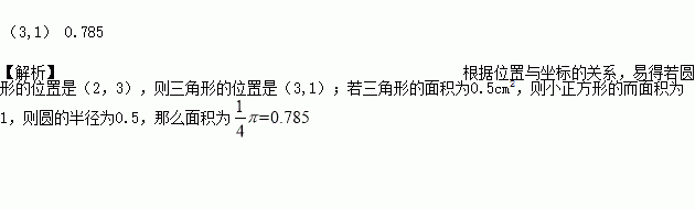 右图中小方格是正方形,若圆形的位置是(2,3),则三角形的位置是(_______);若三角形的面积为0.5cm2,则圆的面积为(_______)cm2。(圆周率取3.14)