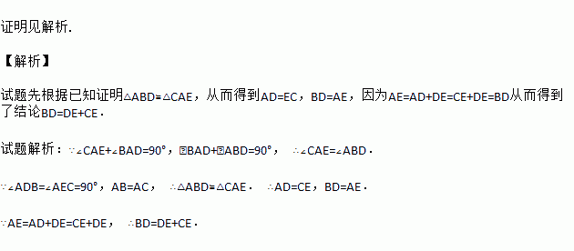 已知如图,AB=AC,∠BAC=90°,AE是过A点的一条直线,且B、C在DE的异侧,BD⊥AE于D,CE⊥AE于E,求证:BD=DE+CE.