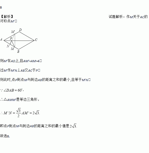 如图,菱形ABCD中,∠DAB=60°,点P是对角线AC上的动点,点M在边AB上,且AM=4,则点P到点M与到边AB的距离之和的最小值是( )