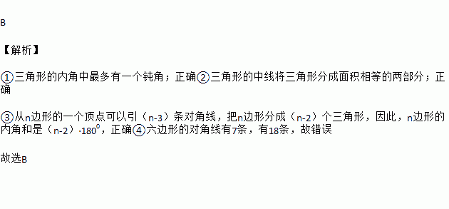 下列说法中,①三角形的内角中最多有一个钝角;②三角形的中线将三角形分成面积相等的两部分;③从n边形的一个顶点可以引(n﹣3)条对角线,把n边形分成(n﹣2)个三角形,因此,n边形的内角和是(n﹣2)•180°;④六边形的对角线有7条,正确的个数有( )