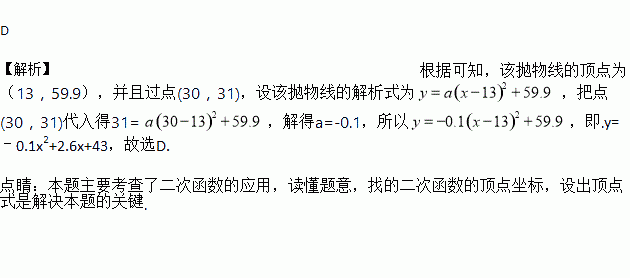 心理学家发现:学生对概念的接受能力y与提出概念的时间x(min)之间是二次函数关系,当提出概念13min时,学生对概念的接受力最大,为59.9;当提出概念30min时,学生对概念的接受能力就剩下31,则y与x满足的二次函数关系式为( )