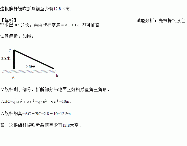 如图,一次“台风”过后,一根旗杆被台风从离地面2.8米处吹断,倒下的旗杆的顶端落在离旗杆底部9.6米处,那么这根旗杆被吹断裂前有多高?