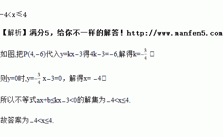 如图,已知函数y=ax+b与函数y=kx-3的图象相交于P(4,-6),则不等式ax+b≤kx-3<0的解集是_______________.