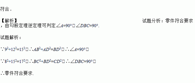 一种机器零件的形状如图,规定这个零件中的 ∠A和 ∠DBC都应为直角,工人师傅量得这个零件各边的尺寸如图(单位:mm),这个零件符合要求吗?
