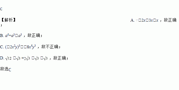 A. -2x+3x=x B. a6÷a3=a3 C. (-2x2y)3=-6x6y3 D. -=