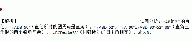 如图,△ABD的三个顶点在⊙O上,AB是直径,点C在⊙O上,且∠ABD=52°,则∠BCD等于( )
