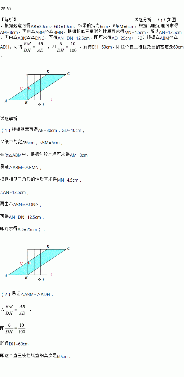 (2)若AD=100cm,纸带在侧面缠绕多圈,正好将这个直三棱柱纸盒的侧面全部包贴满.则这个直三棱柱纸盒的高度是_____cm.