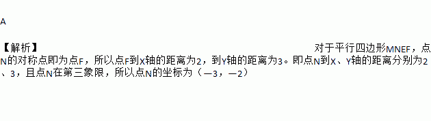 A 【解析】对于平行四边形MNEF,点N的对称点即为点F,所以点F到X轴的距离为2,到Y轴的距离为3。即点N到X、Y轴的距离分别为2、3,且点N在第三象限,所以点N的坐标为(—3,—2)