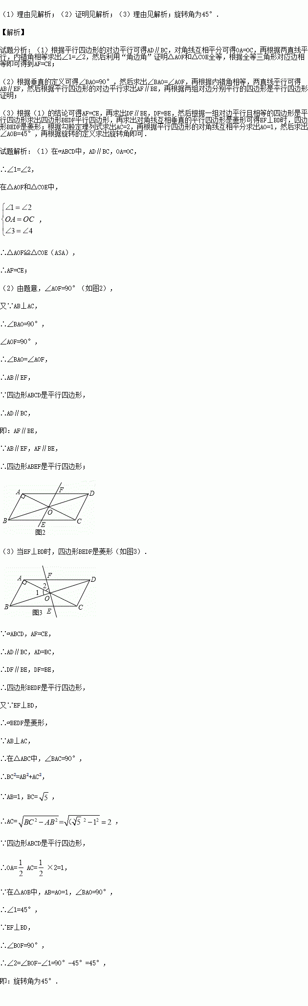 (3)在旋转过程中,四边形BEDF可能是菱形吗?如果不能,请说明理由;如果能,求出此时AC绕点O顺时针旋转的角度.