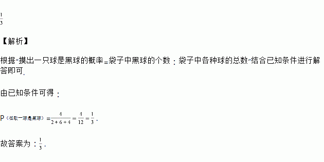在一个布口袋里装有白、红、黑三种颜色的小球,它们除颜色外没有任何区别,其中白球2只,红球6只,黑球4只,将袋中的球搅匀,闭上眼睛随机从袋中取出1只球,则取出黑球的概率是_____.