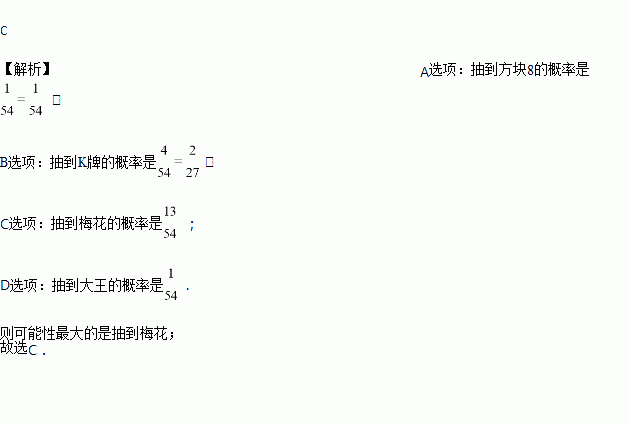 从一副54张的扑克牌中任意抽一张,以下事件中可能性最大的是( )