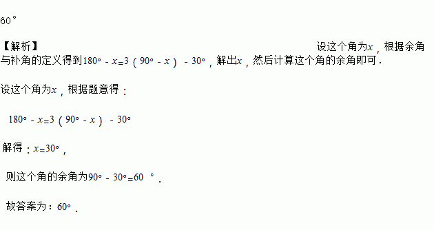 一个角的补角比它的余角的3倍少30°,则这个角的余角是____.