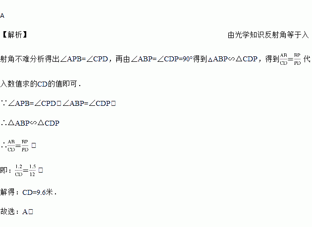 如图是小明设计的利用镜面反射来测量某古城墙CD高度的示意图,如果镜子P与古城墙的距离PD=12米,镜子P与小明的距离BP=1.5米,小明刚好从镜子中看到古城墙顶端C,小明眼睛距离地面的高度AB=1.2米,那么该古城墙的高度是( )