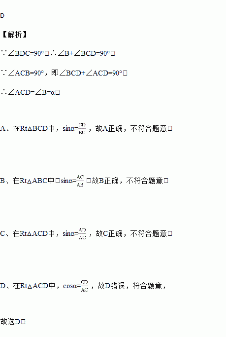 如图,点A为∠α边上任意一点,作AC⊥BC于点C,CD⊥AB于点D,下列用线段比表示sinα的值,错误的是( )