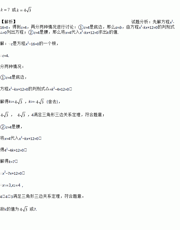 或 【解析】试题分析:先解方程x2-16=0,得到c=4,再分两种情况进行讨论:①c=4是底边,那么a=b,由方程x2-kx+12=0的判别式△=0列出方程;②c=4是腰,那么将x=4代入x2-kx+12=0求出k的值. 【解析】 ∵c是方程x2?16=0的一个根, ∴c=4. 分两种情况: ①c=4是底边, 方程x2?kx+12=0的判别式△=k2?4×12...