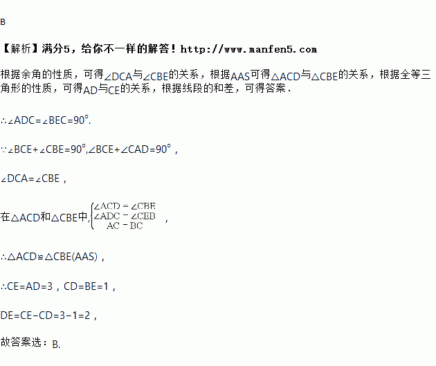 如图,∠ACB=90°,AC=BC,AD⊥CE,BE⊥CE,若AD=3,BE=1,则DE=( )