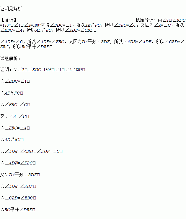 如图,已知∠1+∠2=180°,∠A=∠C,DA平分∠BDF,试说明BC平分∠DBE.