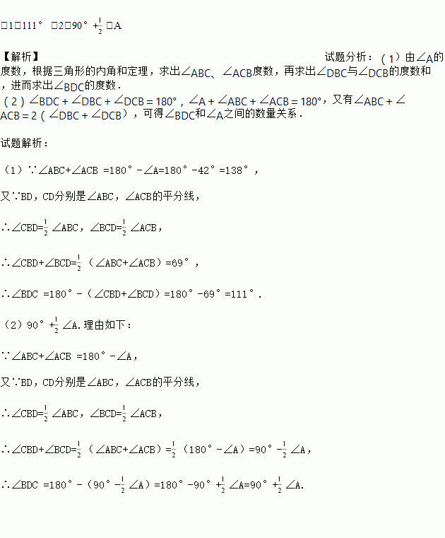 (2)在(1)中去掉∠A=42°这个条件,请探究∠BDC和∠A之间的数量关系.