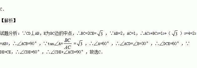 如图,△ABC中,E为BC边的中点,CD⊥AB,AB=2,AC=1,DE=,则∠CDE+∠ACD=( )