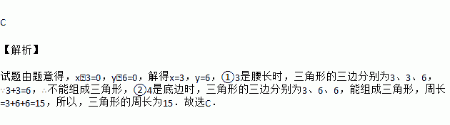 若x,y满足|x-3|+=0,则以x,y的值为两边长的等腰三角形的周长为( )