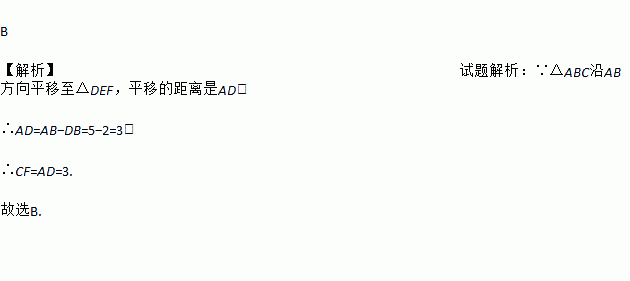 如图,将△ABC沿AB方向平移至△DEF,且AB=5,DB=2,则CF的长度为( )