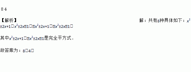 8 4 【解析】【解析】 共有8种具体如下:x2±2x+1;x2±2x﹣1;﹣x2±2x+1;﹣x2±2x﹣1. 其中x2±2x+1、﹣x2±2x﹣1是完全平方式. 故答案为:8,4.
