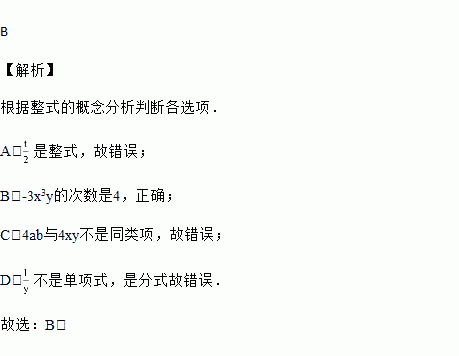 A. 不是整式 B. ﹣3x3y的次数是4 C. 4ab与4xy是同类项 D. 是单项式