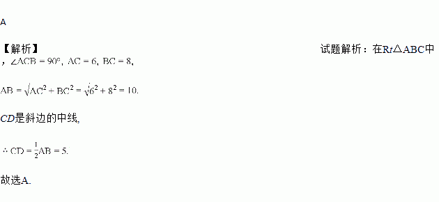 如图,在Rt△ABC中,∠ACB=90°,AC=6,BC=8,则Rt△ABC的中线CD的长为( )