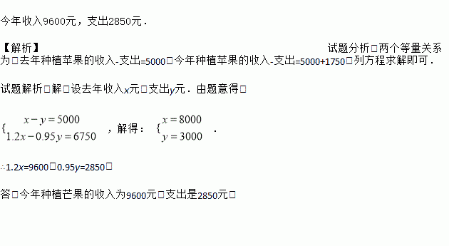 小刚家去年种植芒果收入扣除各项支出后结余5000元,今年又喜获丰收,比去年增收20%,而今年支出比去年减少5%,因此今年结余比去年多1750元,求小刚家今年种植芒果的收入和支出各是多少元?