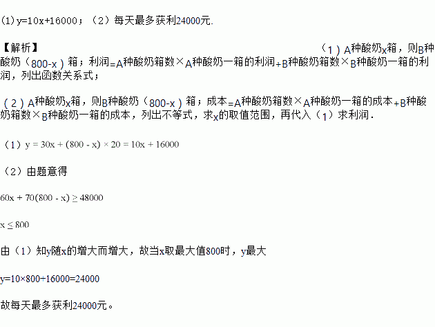 (2)如果该酸奶厂每天至少投入成本48000元,那么每天最多获利多少元?
