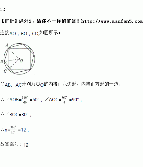 如图,AB,AC分别为⊙O的内接正六边形,内接正方形的一边,BC是圆内接n边形的一边,则n等于_____.