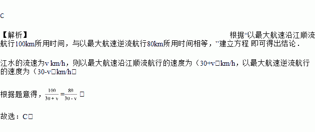 一艘轮船在静水中的最大航速为30km/h,它以最大航速沿江顺流航行100km所用时间,与以最大航速逆流航行80km所用时间相等,设江水的流速为v km/h,则可列方程为( )