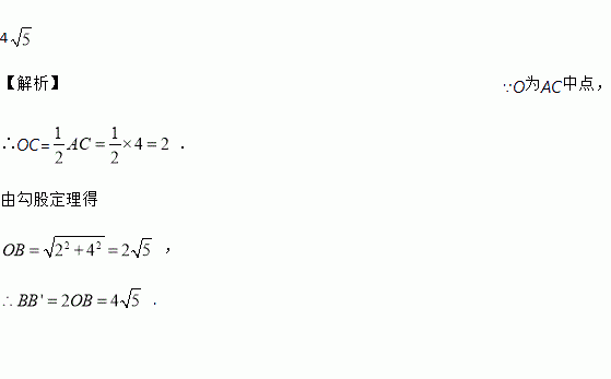 如图所示,在△ABC中,∠C=90°,AC=BC=4cm.若以AC的中点O为旋转中心,将这个三角形旋转180°后,点B落在B′处,则BB′=________cm.