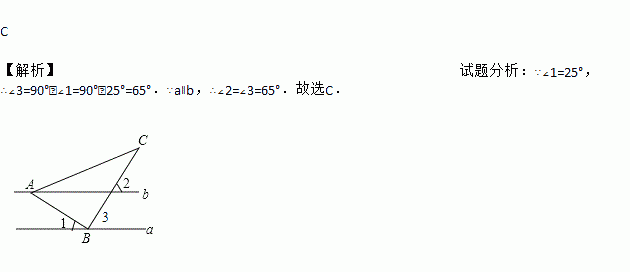 如图,直线a∥b,Rt△ABC的直角顶点B落在直线a上,若∠1=25°,则∠2的大小为( )