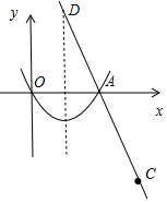 18.已知抛物线$y=\frac{1}{2}{x^2}+bx$经过点A(2,0).设点C(3,-3),请在抛物线的对称轴上确定一点D,使得|AD-CD|的值最大,则D点的坐标为(1,3).分析 依照题意画出图形,连接AC交抛物线的对称轴于点D,根据三角形内两边之差小于第三边可得出此种作法得出的点D使得|AD-CD|的值最大,将点A的坐标代入抛物线解析式即可得出关于b的一元一次方程,解方程即可得出抛物线的解析式,由抛物线的解析式可得出抛物线的对称轴的解析式,由待定系数法求出直线AC的解析式,令x=1即可得出结论.