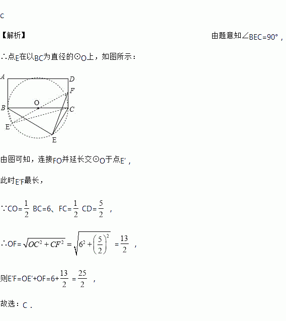 如图,在矩形ABCD中,AB=5,AD=12,以BC为斜边在矩形外部作直角三角形BEC,F为CD的中点,则EF的最大值为( )