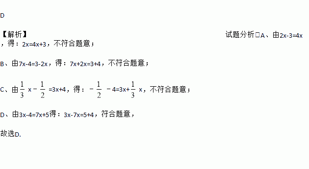 D 【解析】试题分析:A、由2x-3=4x,得:2x=4x+3,不符合题意; B、由7x-4=3-2x,得:7x+2x=3+4,不符合题意; C、由x﹣=3x+4,得:﹣﹣4=3x+x,不符合题意; D、由3x-4=7x+5得:3x-7x=5+4,符合题意, 故选D.