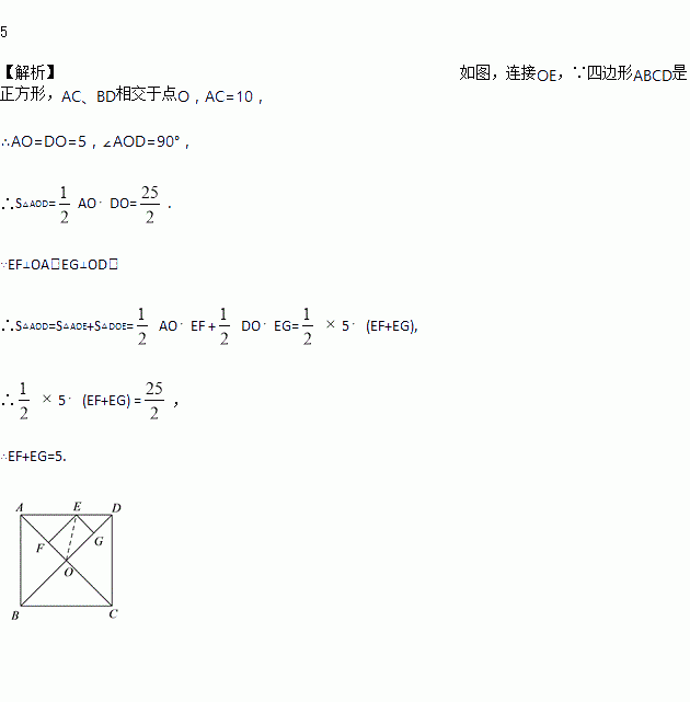 如图,E是正方形ABCD的边AD上一点,对角线AC,BD交于一点O,EF⊥AC于点F,EG⊥BD于点G,若AC=10,则EF+EG=_______