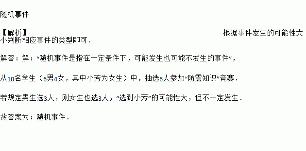 从10名学生(6男4女,其中小芳为女生)中,抽选6人参加“防震知识”竞赛.若规定男生选3人,则“选到小芳”的事件应该是____(选填“必然事件、不可能事件、随机事件”).