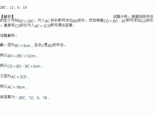 Èçͼ£¬µãABCDÔÚͬһÌõÏß¶ÎÉÏ£¬ÒÑÖªBC=6cm£¬AC=3CD£¬ÇÒµãCÊÇBDµÄÖе㡣ÇóBDºÍACµÄ³¤¡£Ç벹ȫÒÔϽâ´ð¹ý³Ì