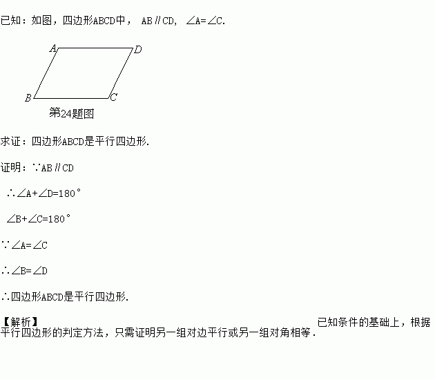 求证:有一组对边平行,和一组对角相等的四边形是平行四边形.(请画出图形,写出已知、求证并证明)