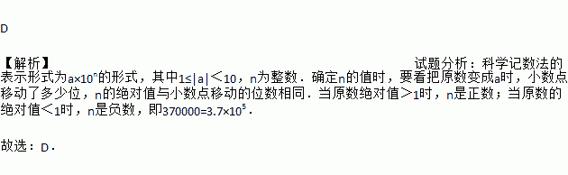 D 【解析】试题分析:科学记数法的表示形式为a×10n的形式,其中1≤|a|<10,n为整数.确定n的值时,要看把原数变成a时,小数点移动了多少位,n的绝对值与小数点移动的位数相同.当原数绝对值>1时,n是正数;当原数的绝对值<1时,n是负数,即370000=3.7×105. 故选:D.
