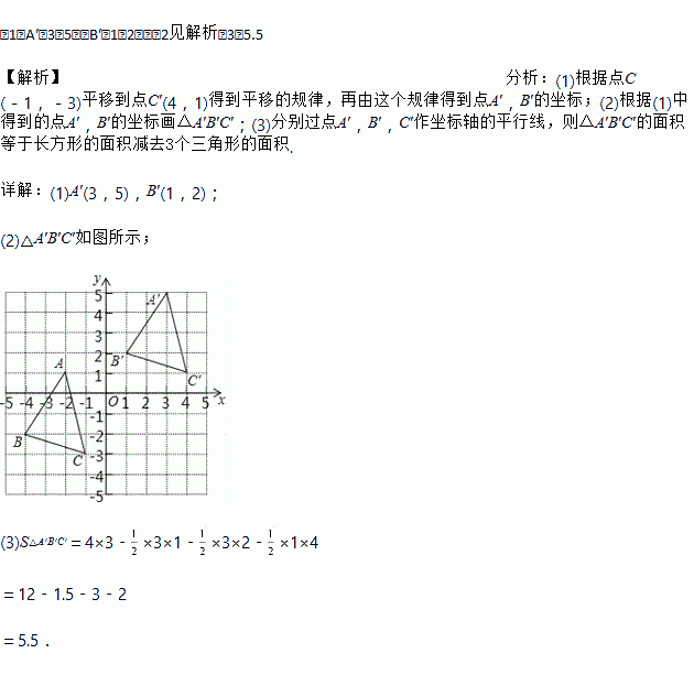 如图,在平面直角坐标系中,已知A(﹣2,1)、B(﹣4,﹣2)、C(﹣1,﹣3),把△ABC平移之后得到△A′B′C′,并且C的对应点C′的坐标为(4,1).