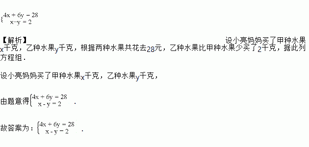 小亮的妈妈用28元钱买了甲、乙两种水果,甲种水果每千克4元,乙种水果每千克6元,且乙种水果比甲种水果少买了2千克,求小亮妈妈两种水果各买了多少千克?设小亮妈妈买了甲种水果x千克,乙种水果y千克,则可列方程组为_________________.