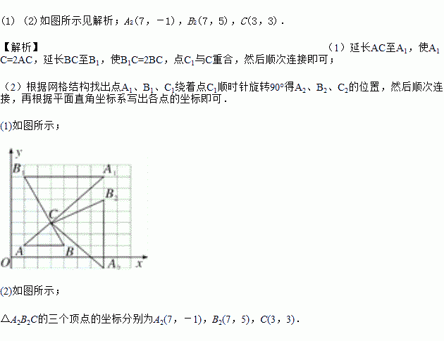 (2)将△A1B1C绕着点C顺时针旋转90°得△A2B2C,画出图形,并在如图所示的坐标系中分别写出△A2B2C三个顶点的坐标.