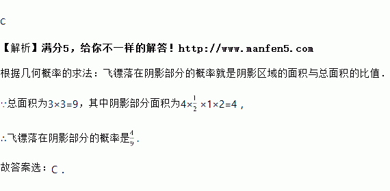 如图,飞镖游戏板中每一块小正方形除颜色外都相同.若某人向游戏板投掷飞镖一次(假设飞镖落在游戏板上),则飞镖落在阴影部分的概率是( )