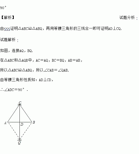 如图,已知线段AB,分别以A、B为圆心,大于线段AB长为半径画弧,两弧相交于点C、Q,连接CQ与AB相交于点D,连接AC,BC,求∠ADC的度数.