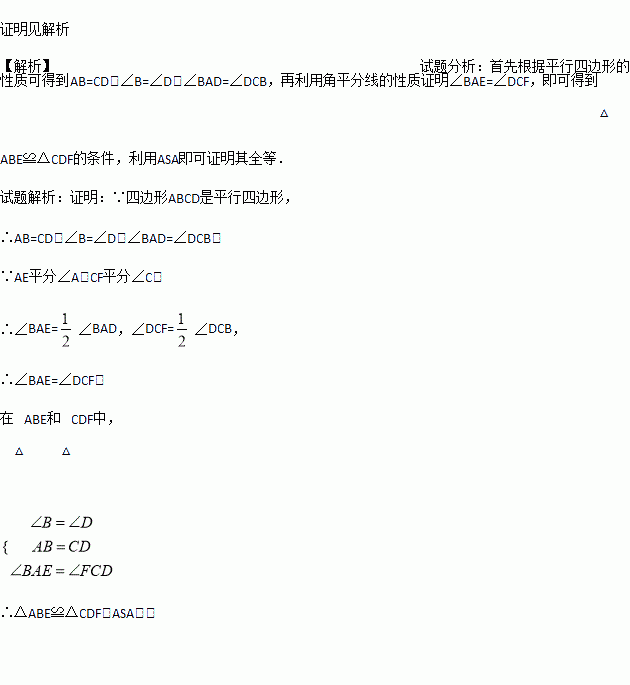 已知,如图,?ABCD中,AE平分∠BAD,交BC于点E,CF平分∠DCB,交AD于点F.求证:△ABE≌△CDF.