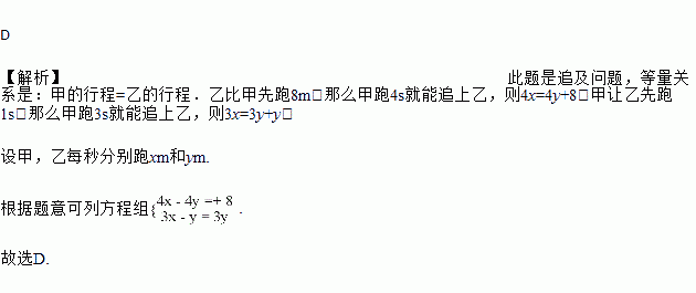 甲、乙二人赛跑,如果乙比甲先跑8m,那么甲跑4s就能追上乙;如果甲让乙先跑1s,那么甲跑3s就能追上乙,设甲、乙每秒分别跑xm和ym,则可列出的方程组是( )